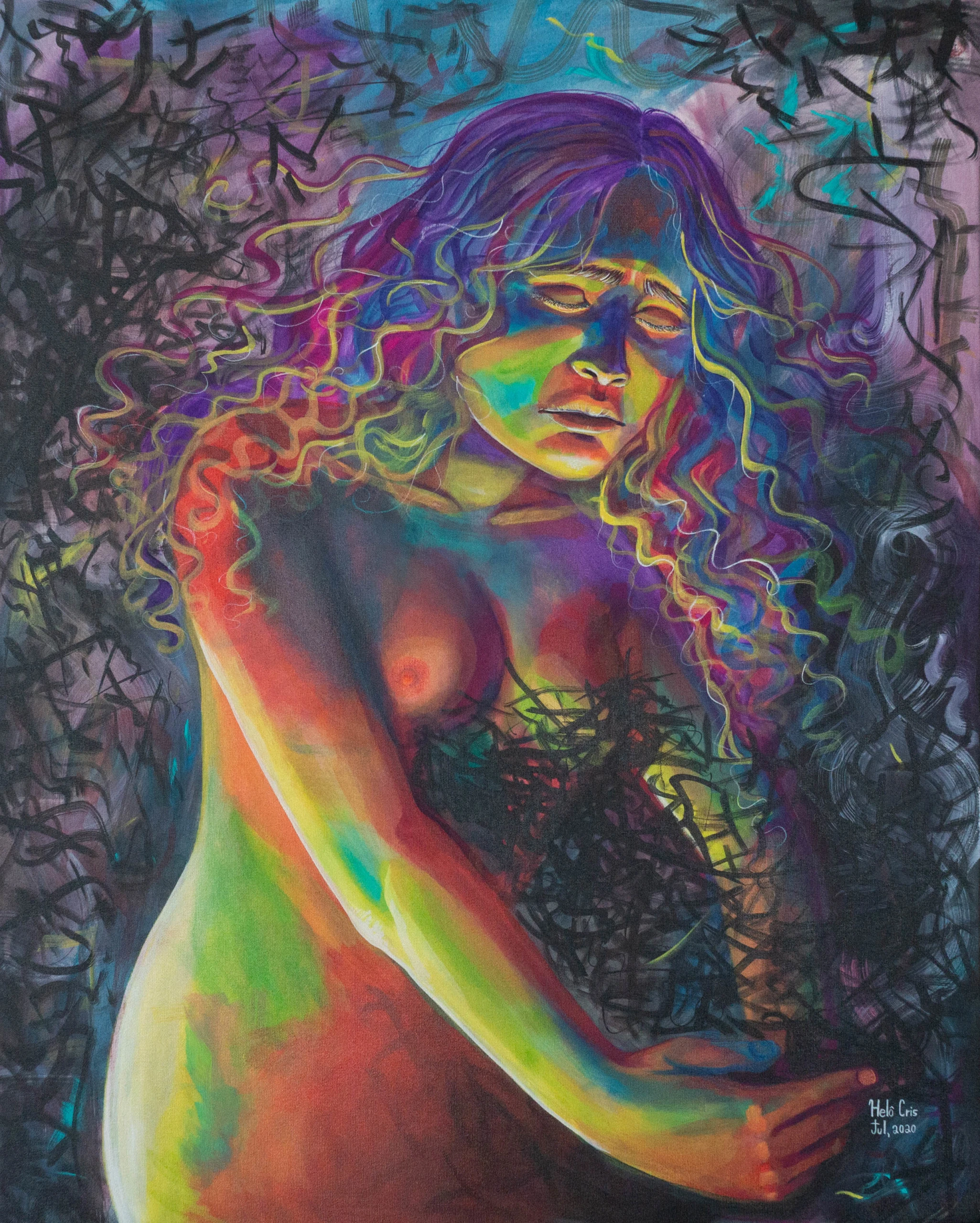 Tinta acrílica sobre tela, 80X100 cm, 2020. Pintura da Série “Eternidade”, esse nome é inspirado no ciclo da nossa transformação. Sempre há uma nova camada de redescoberta nos sentimentos humanos. É este misterioso Eterno que nos dá força, tristeza, alegria, raiva, esperança, entre tantos outros sentimentos, é esse processo que dá cor à própria vida.